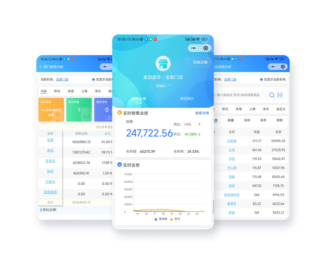 门店运营情况实时监控,商品销售情况管控,销售趋势及毛利实时掌握。