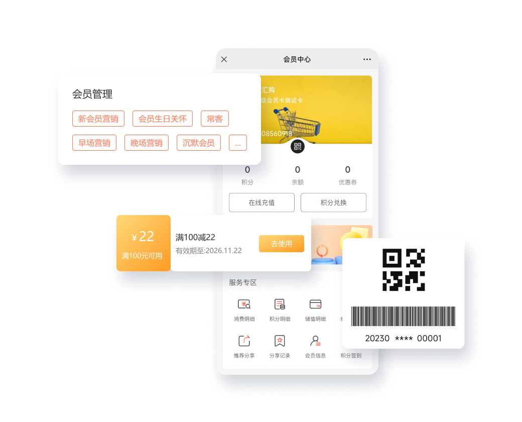 线上线下会员一体管理,打通微信卡包、券包功能,实现会员招募数字化、会员管理标签化、会员营销精准化的线上会员运营管理体系。