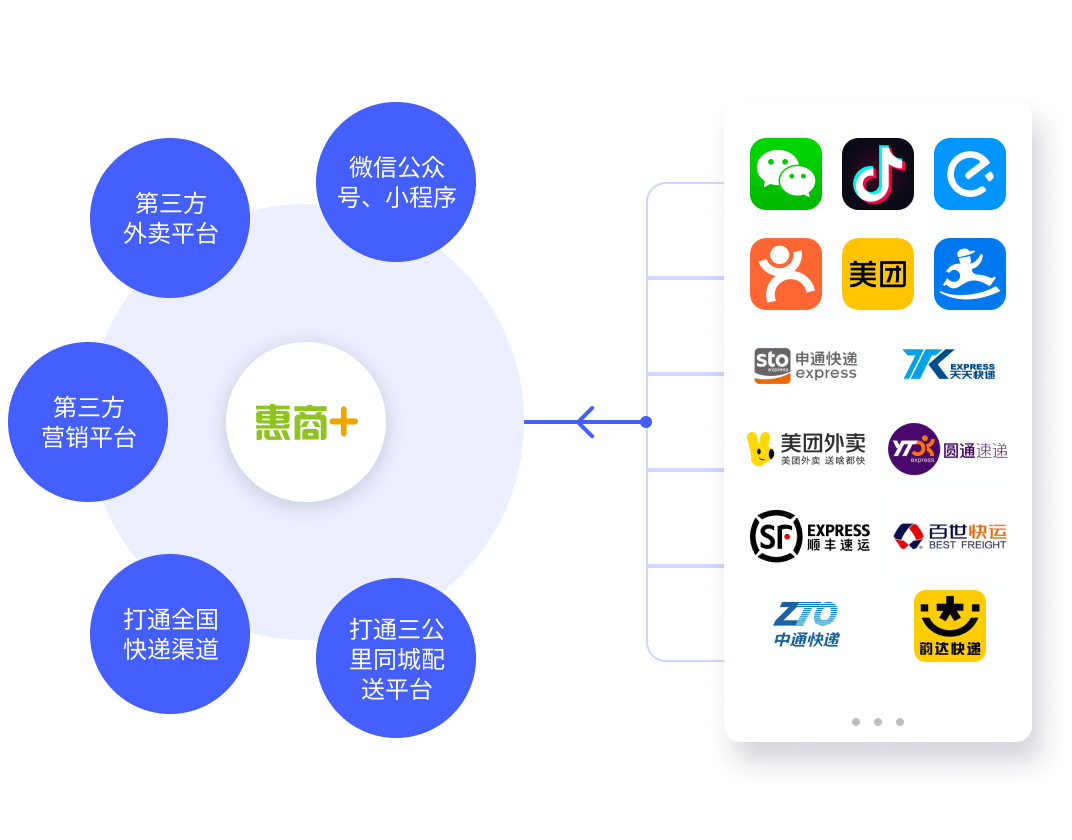 一体化接入三方平台的外卖及营销能力,构建商户线上线下一体化的自有商城。